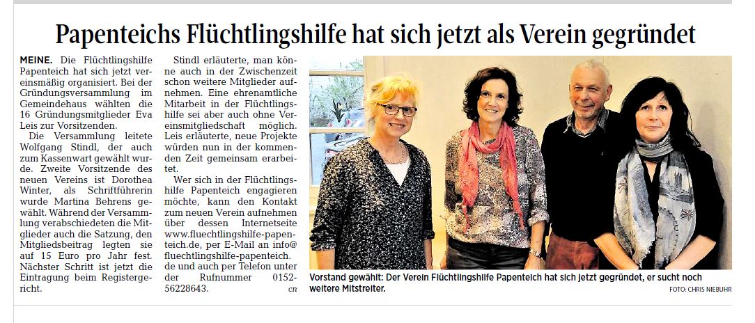 Am Montag, dem 10.04.2017 hat sich aus der Flüchtlingshilfe Papenteich heraus der Verein Flüchtlingshilfe Papenteich e.V. gegründet. Mit Schreiben vom 30.06.2017 bestätigte das Amtsgericht Hildesheim die Eintragung ins Vereinsregister.