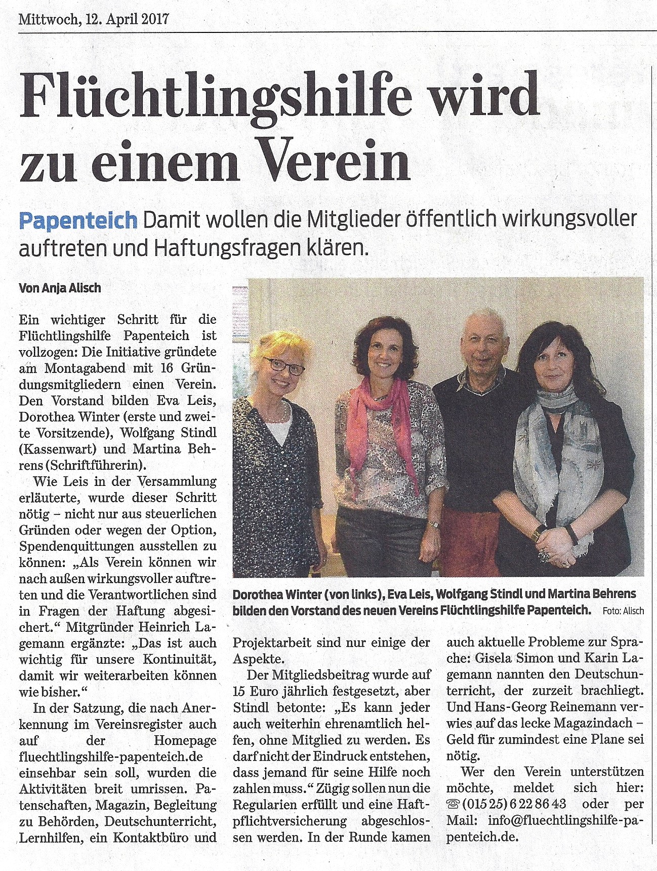 In der Folgezeit ist es nicht bei den 16 Gründungsmitgliedern geblieben und wir hoffen auf weitere Mitbürger, die innerhalb der Flüchtlingshilfe Papenteich e.V. in bewährten Strukturen mitarbeiten wollen.