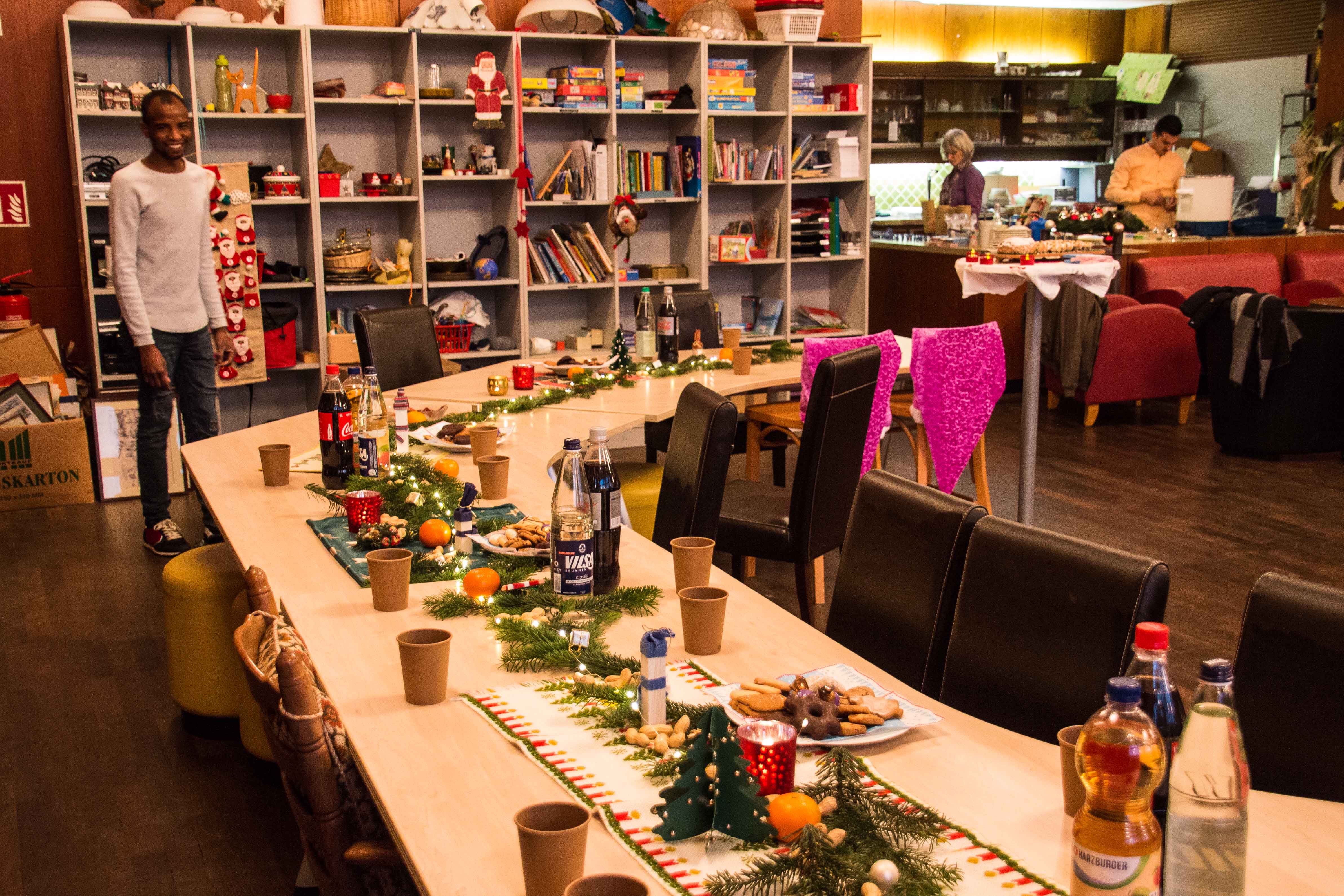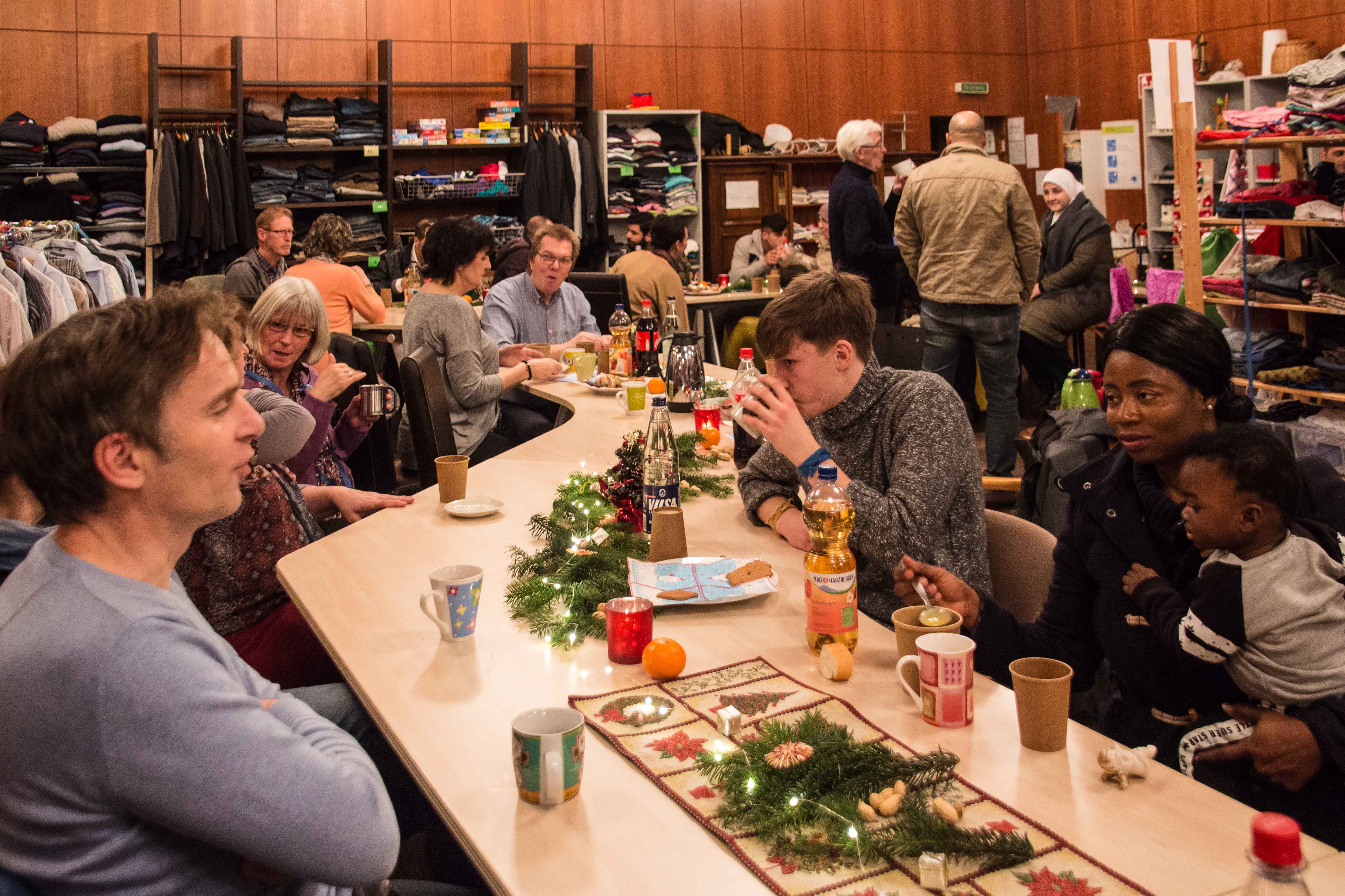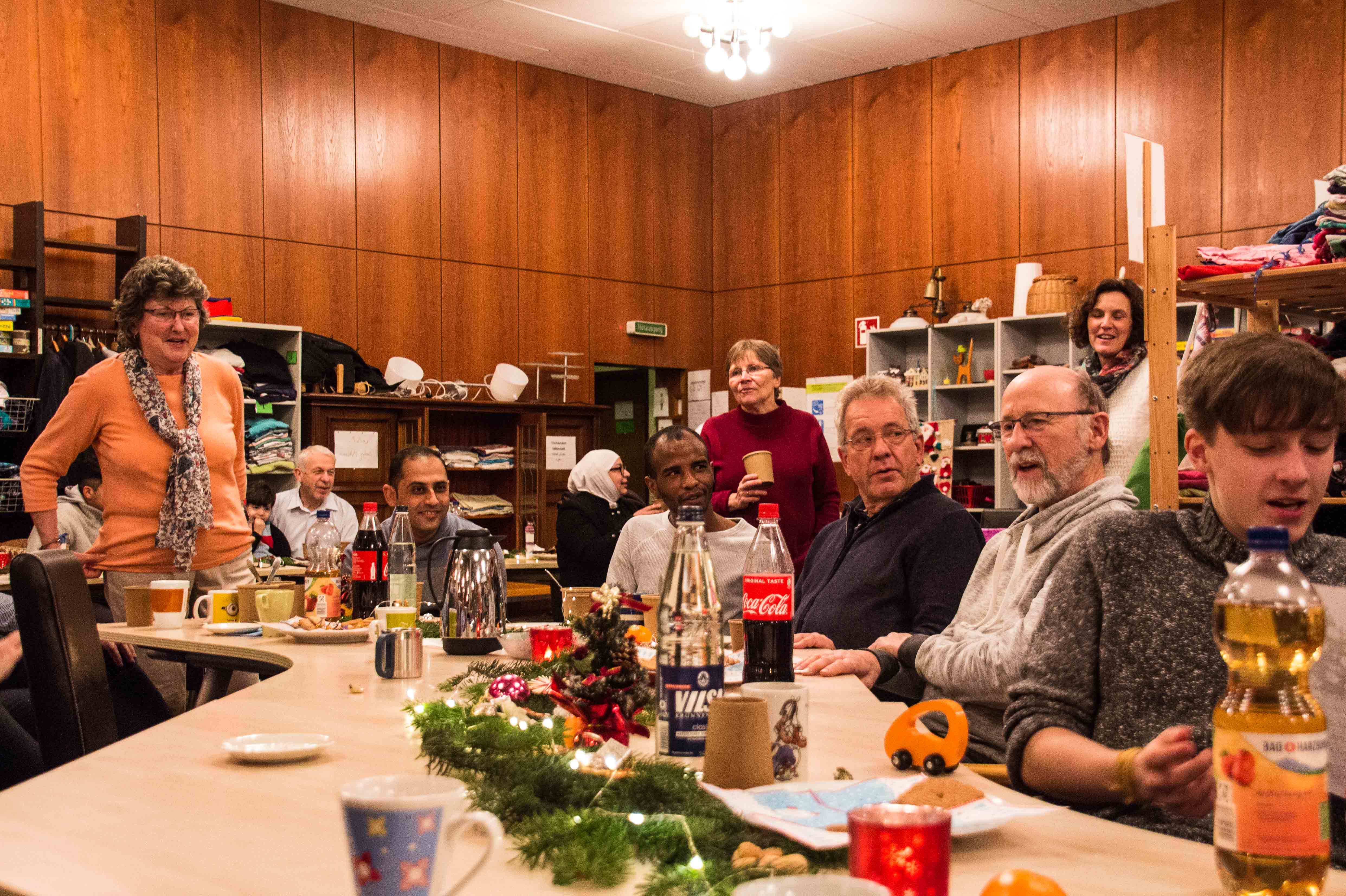 Für die letzten Tage des alten Jahres ist das Magazin nun geschlossen, doch am Mittwoch, dem 19.12.2018 war noch einmal Hochbetrieb. Rund 60 Geflüchtete und Flüchtlingshelfer waren der Einladung zur Weihnachtsfeier gefolgt, auch die Männer aus der Fahrrad-Werkstatt konnten jetzt mal ohne ölverschmierte Finger im großen Saal dabei sein.