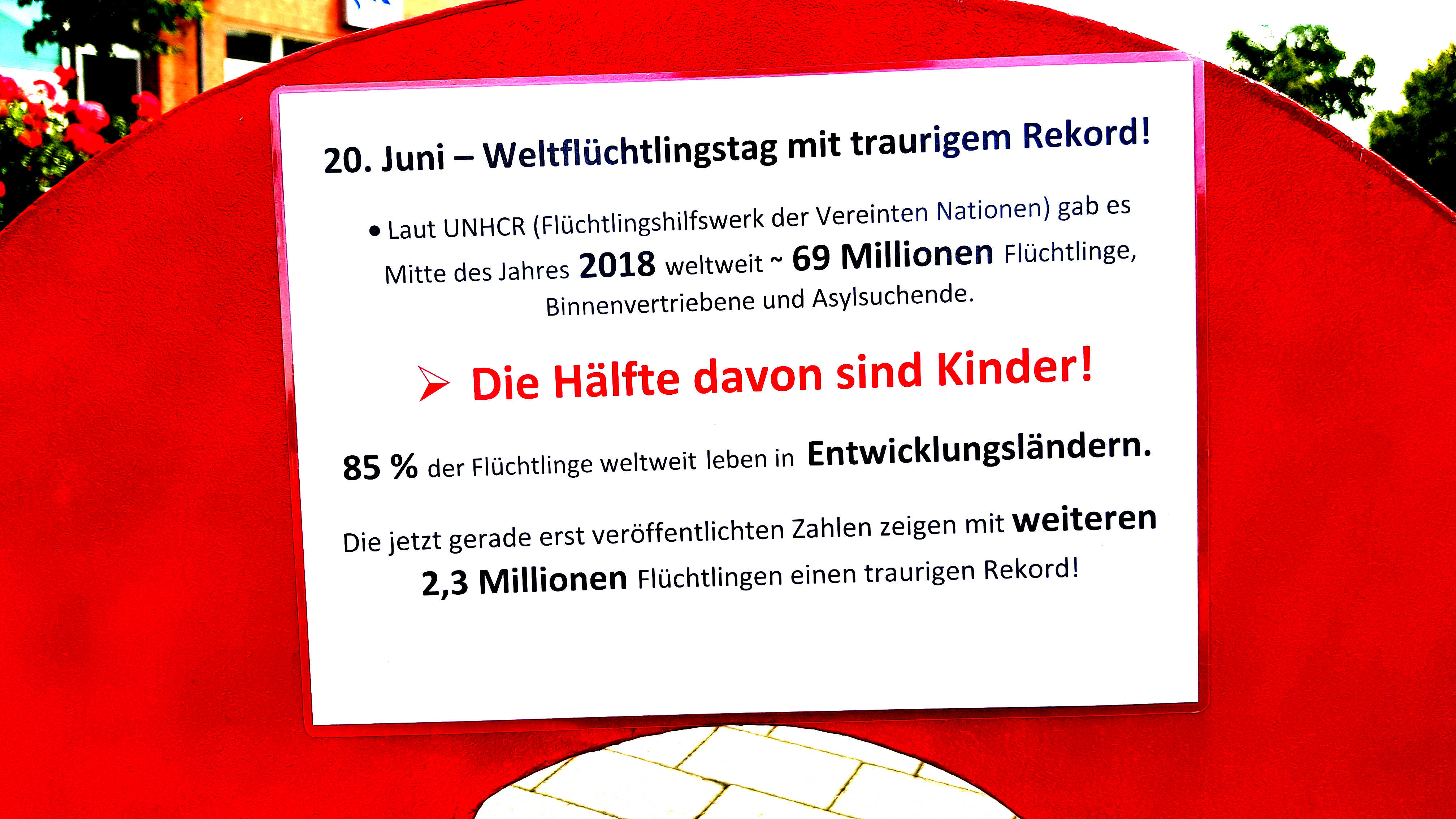 Die Aktion sollte darauf aufmerksam machen, dass es 2018 laut UN-Flüchtlingswerk UNHCR weltweit fast 69 Millionen Flüchtlinge, Asylsuchende und Binnenvertriebene gab. Tendenz weiter steigend. Mehr als die Hälfte davon sind Kinder, das symbolisierten die Spielsachen.
