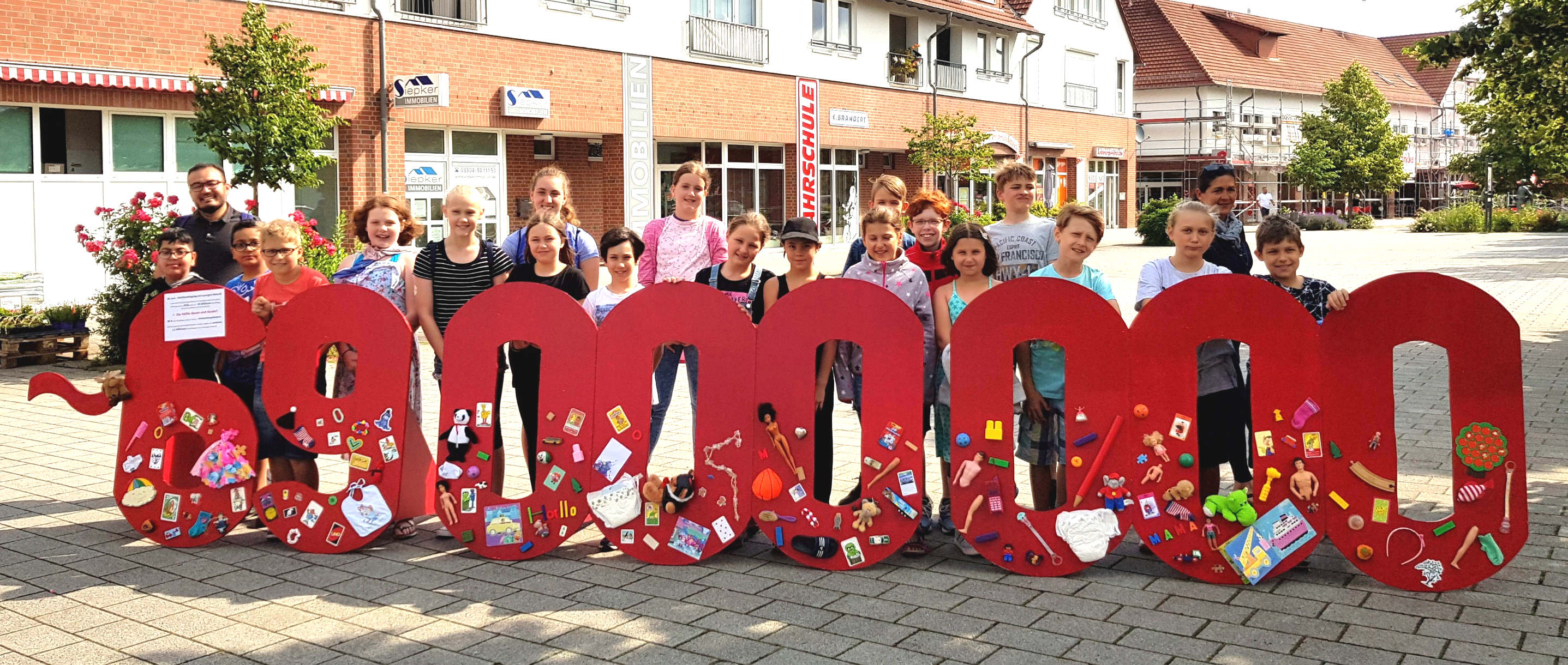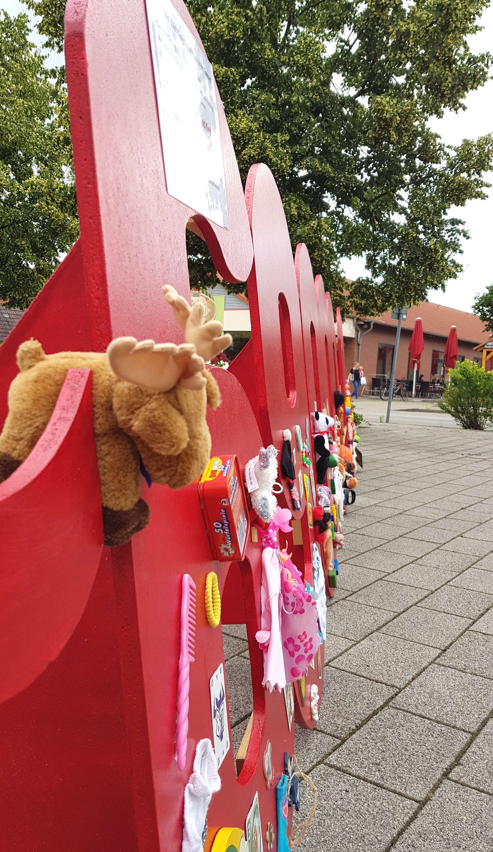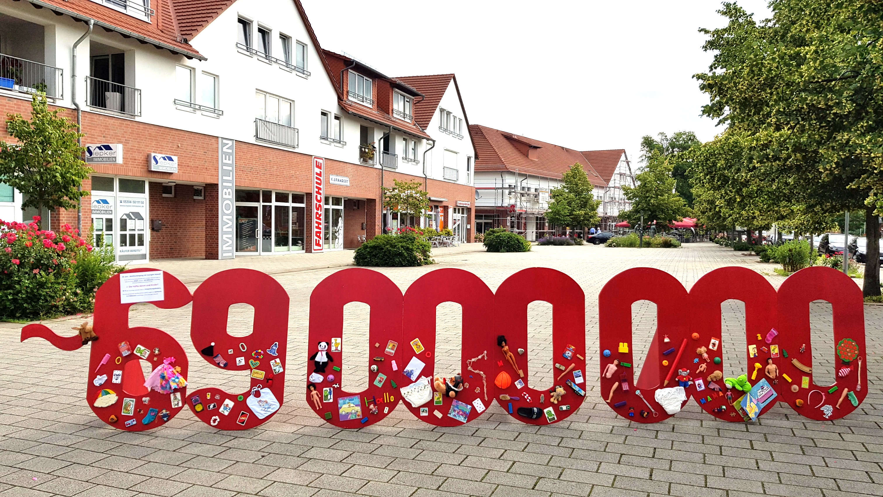Wer am Donnerstag, den 20. Juni in der Meiner Mitte unterwegs war, konnte sicher die große aufgestellte Zahl auf dem Marktplatz nicht übersehen. Mit einer Höhe von 115 cm und einer Gesamtbreite von etwa 650 cm stachen die signalroten 69 000 000 schon von weitem ins Auge. Zur Hälfte bestückt mit Kuscheltieren, Barbie, Windeln Socken und allerlei Spielsachen lockte das Holzgebilde etliche Neugierige an… und genau das war der Plan!