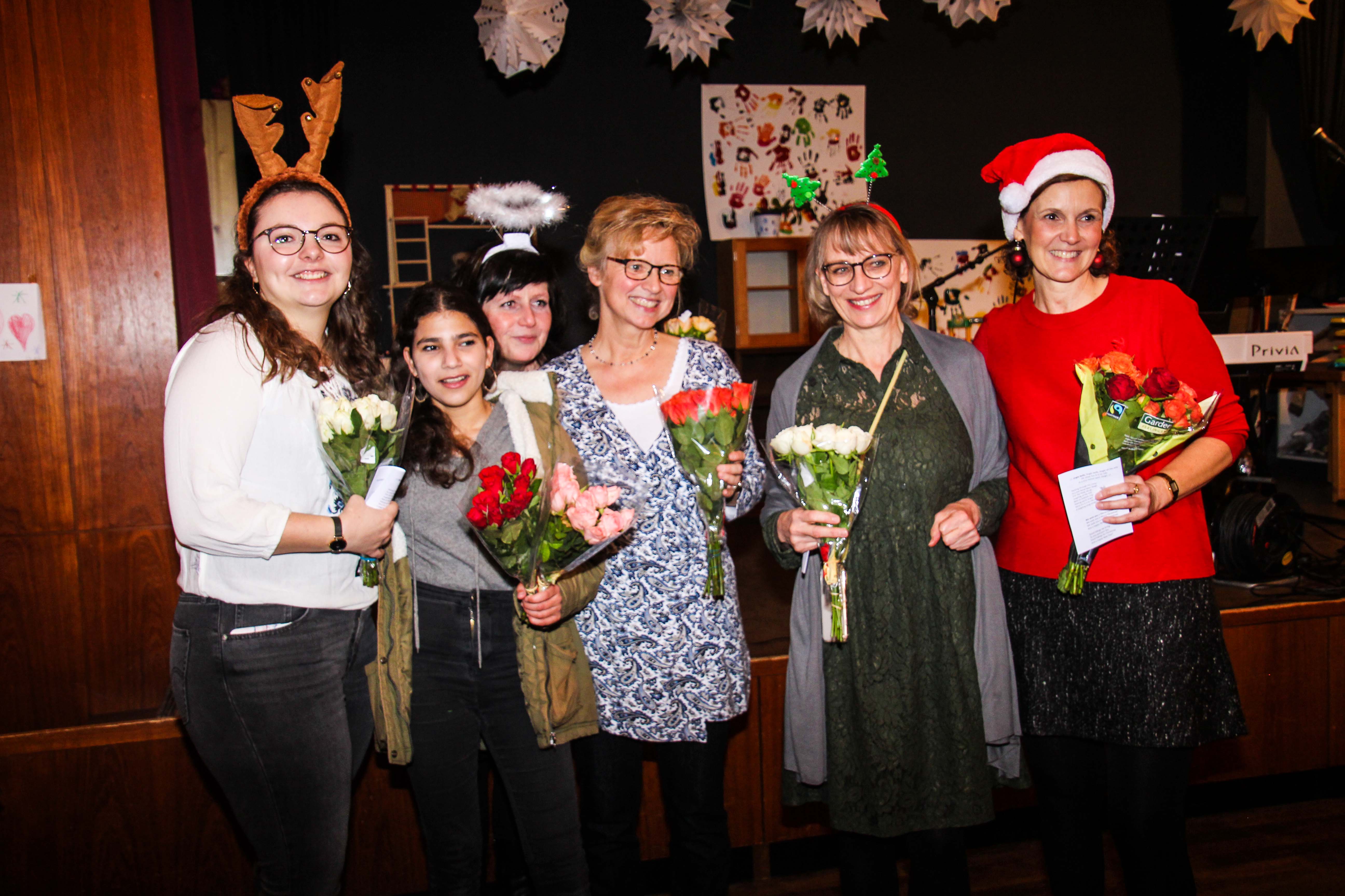 Aber auch die Flüchtlingshelfer wurden beschenkt. Die 17-jährige Sahar verteilte im Namen ihrer Familie Rosensträuße und dankte damit der Flüchtlingshilfe. Gerade Kinder dieser Altersklasse hatten und haben es sehr schwer, denn sie kamen ohne jegliche Sprachkenntnisse vor 3 oder 4 Jahren nach Deutschland, waren oft traumatisiert durch die Flucht. Trotzdem wurden sie dann „altersgemäß eingeschult“, was ohne Unterstützung fast unmöglich gelingen kann. Im Falle von Sahar war es z.B. die 7. Klasse, in der sie mitten im Schuljahr Fuß fassen sollte. Für uns Flüchtlingshelfer ist es dann umso schöner, wenn wir wie bei Sahar erleben dürfen, wie unsere Arbeit sich auszahlt, wie junge Menschen es schaffen, bei uns anzukommen.