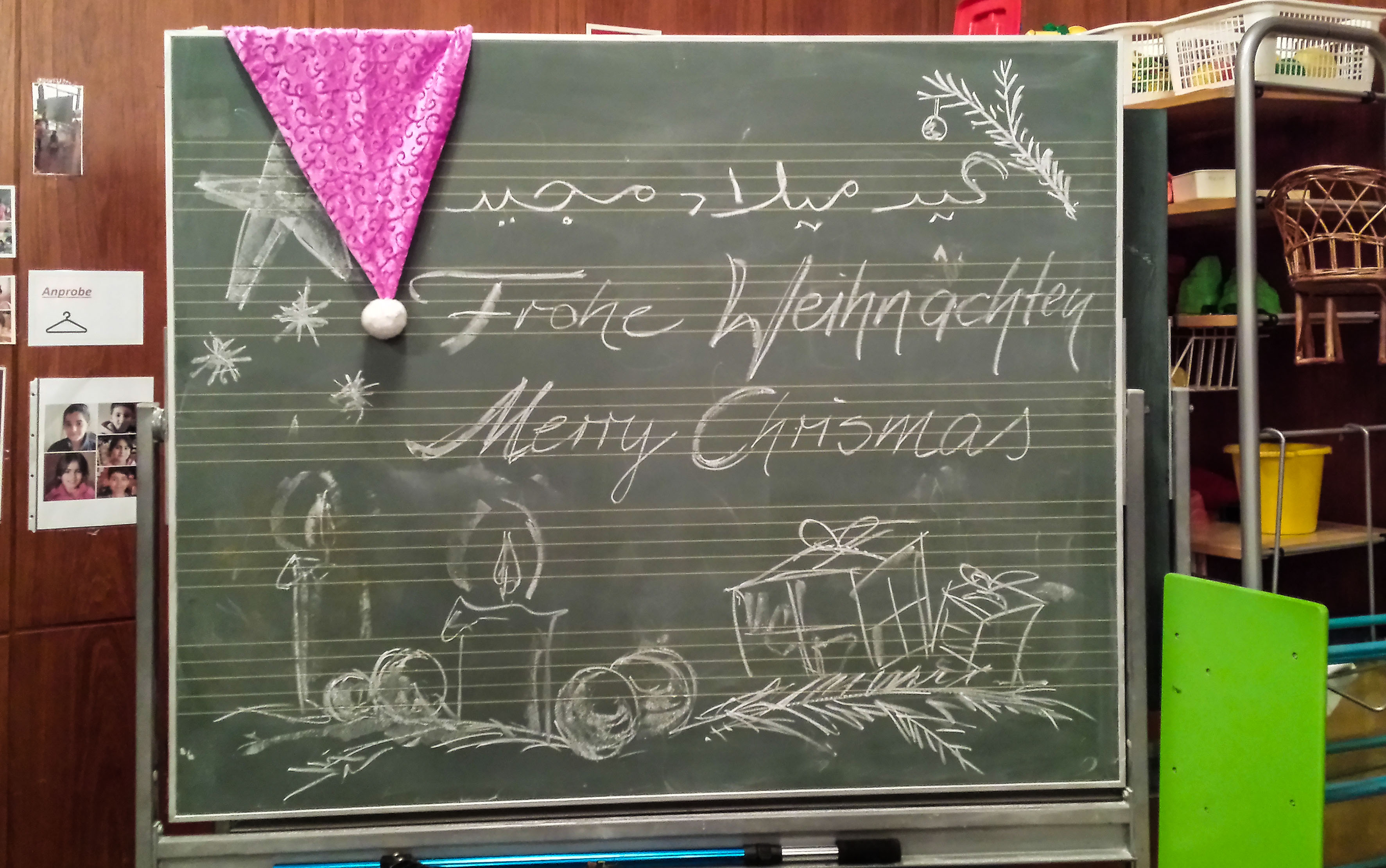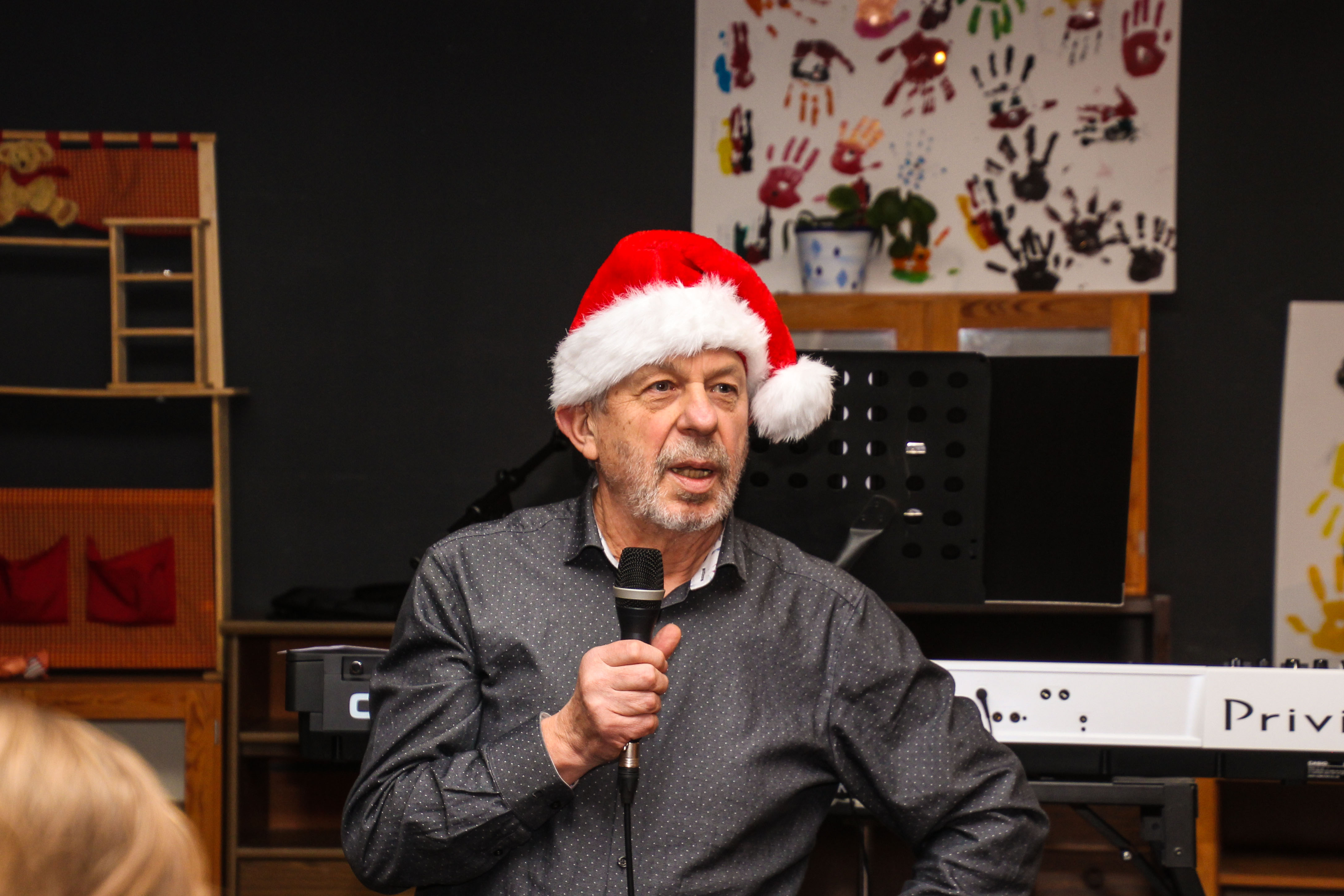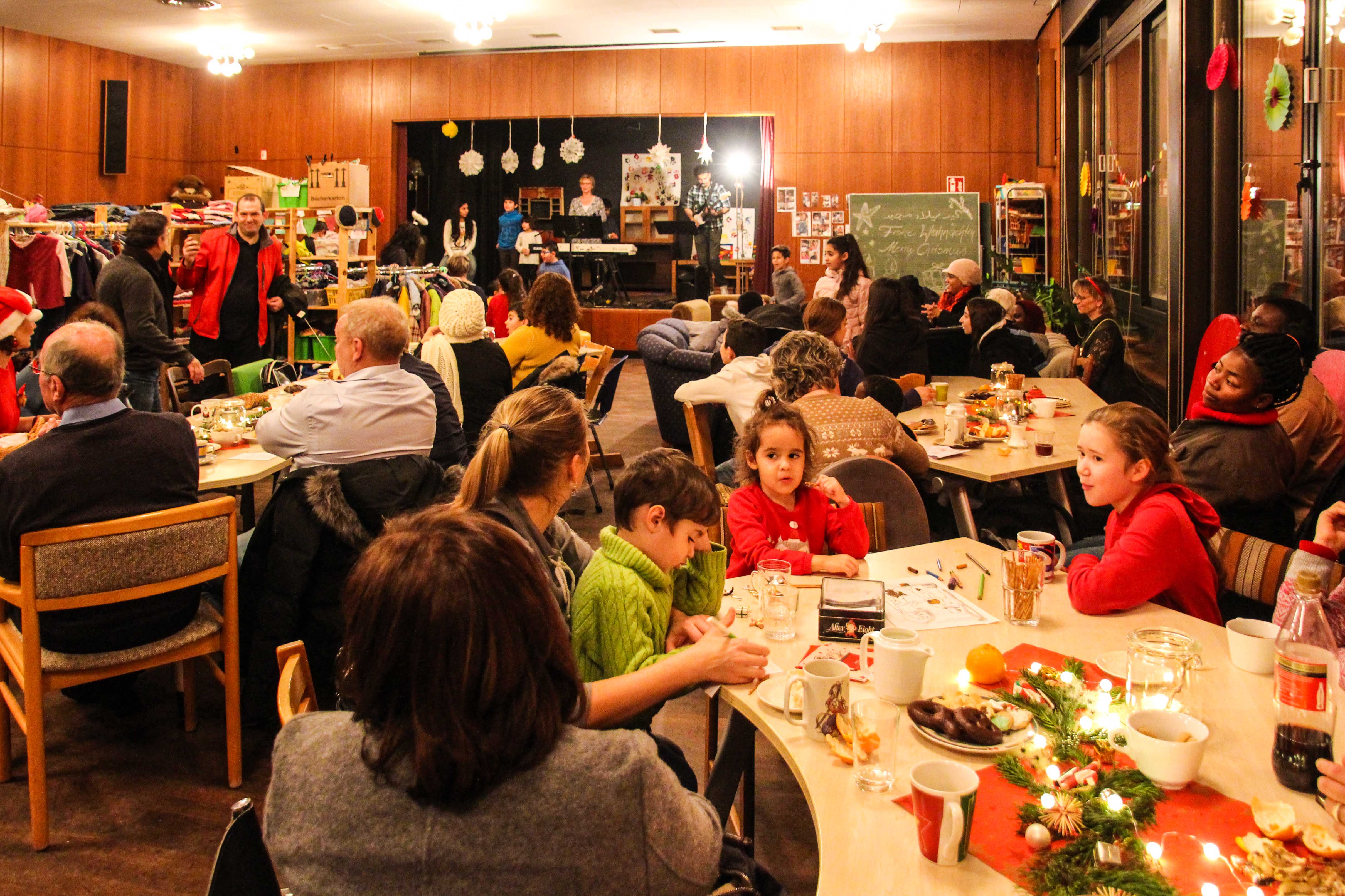 Für die richtige Stimmung sorgten die ganze Zeit über auf der Bühne Sarah, Hossein und Johannes, aber auch Doro griff in die Tasten und gab den richtigen Ton vor für gemeinsam gesungene weihnachtliche Lieder. Mehrere Kinder trauten sich, vor so vielen Menschen Gedichte vorzutragen und sie machten es sehr gut. Nicht nur dadurch wurde eindrucksvoll deutlich, wie gut die Kinder inzwischen deutsch gelernt haben, auch in den Gesprächen der Erwachsenen kann mittlerweile ganz anders miteinander kommuniziert werden als zu Beginn unserer Arbeit vor mehr als dreieinhalb Jahren.
