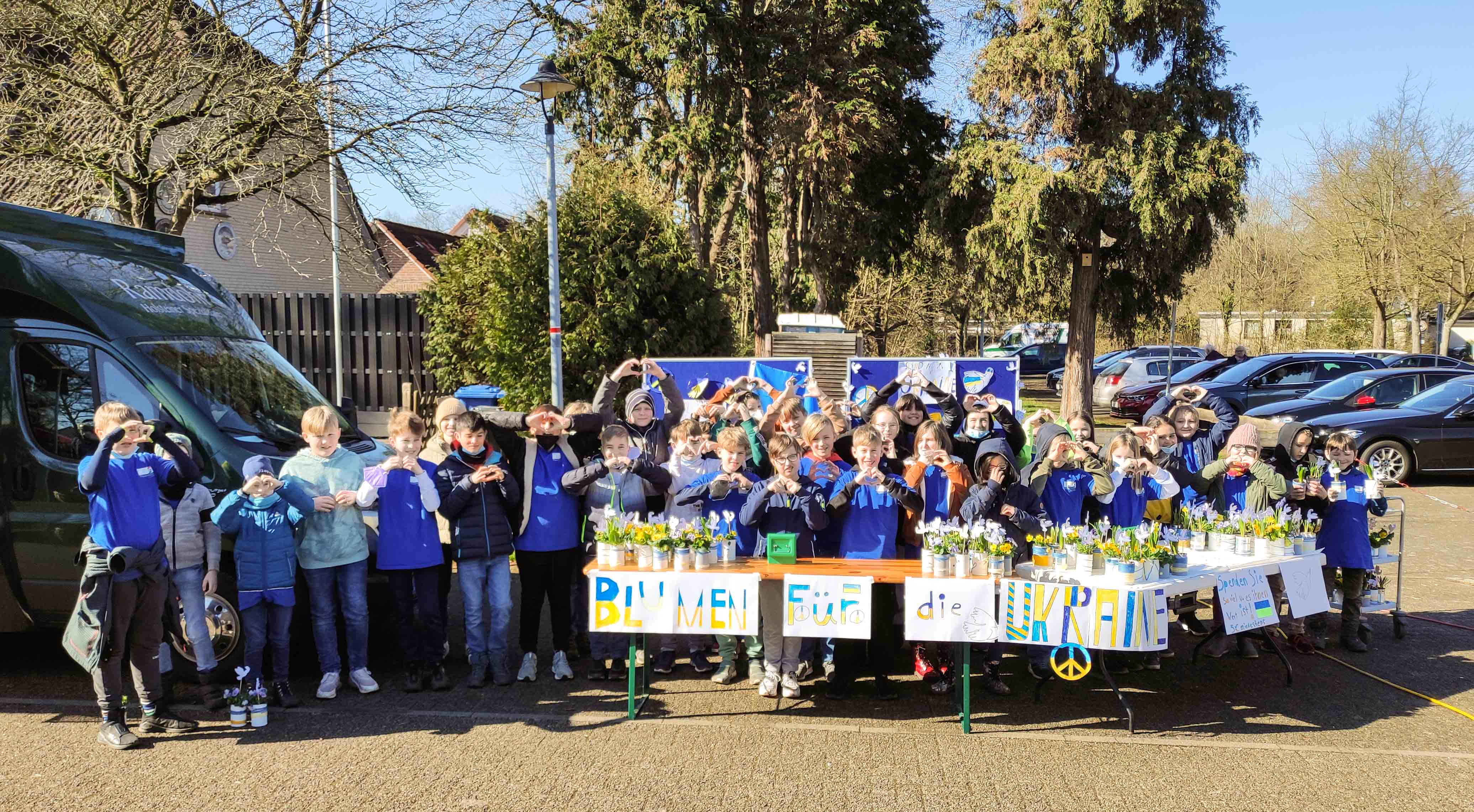 Es war eine Idee der Schülerinnen und Schüler, und sie waren es auch, die es umsetzten: Um Spendengelder zugunsten der Ukraine zu sammeln, bastelten sie in den vergangenen Tagen insgesamt 150 liebevoll gestaltete Blumentöpfe aus Konservendosen. Hineingepflanzt wurden Frühlingsblumen und Blumenzwiebeln, zusätzlich dekoriert durch Friedenstauben und den Nationalfarben der Ukraine. Gegen eine Spende von mindestens 5 Euro konnte man diese Blumentöpfe nun am Freitag, den 18. März auf dem Markt in Groß Schwülper erwerben. Mit den Lehrerinnen Frau Cruse und Frau Kratschmer präsentierten sie ihre Werke vor einer Stellwand, auf der Friedenssymbole dominierten. Es dauerte nicht mal eine Stunde, da war alles vergriffen.