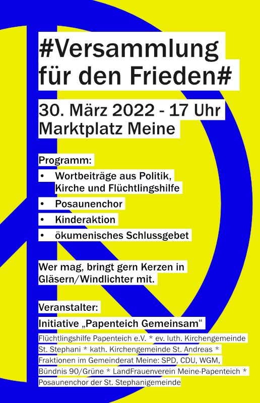 Die Initiative „Papenteich gemeinsam“ hatte für den 30.03. zu einer Veranstaltung auf dem Marktplatz in Meine eingeladen. Die Veranstaltung dauerte von 17:00 bis 18:00. Etwa 200 Leute waren anwesend. Durch eine Spendensammlung kam ein Betrag von über 500 Euro zusammen, die der Flüchtlingshilfe zur Verfügung gestellt wurde.