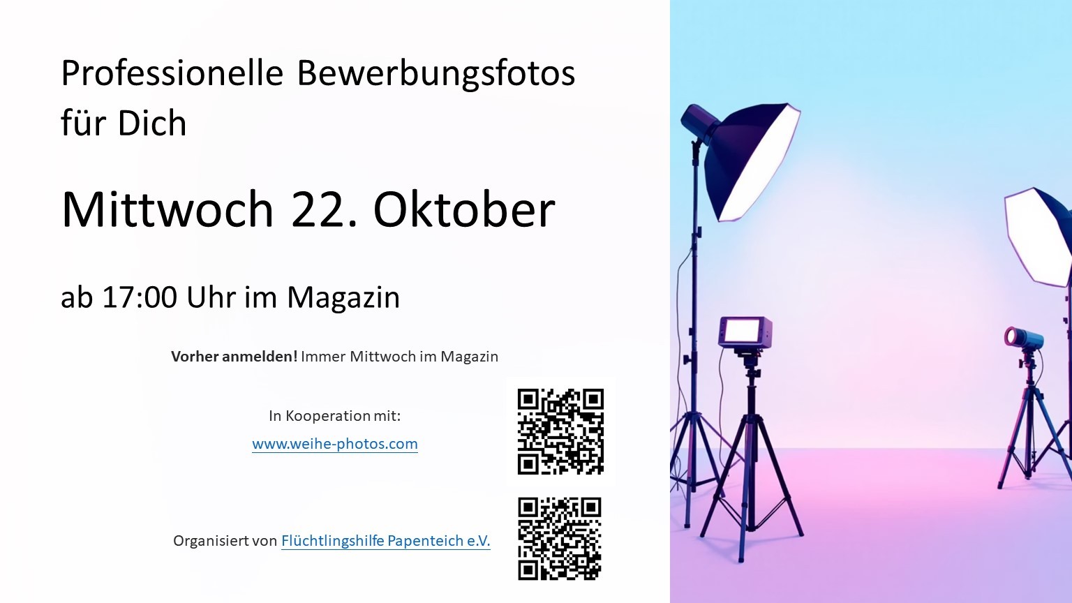 Wir bieten allen Geflüchteten die Anfertigung hochwertiger Fotos z.B. für Bewerbungen. Am Mittwoch, den 22.10.25 um 17:00 kommt zu diesem Zwecke ein professioneller Fotograf ins Magazin. Dieses Angebot ist für die Geflüchteten kostenlos.