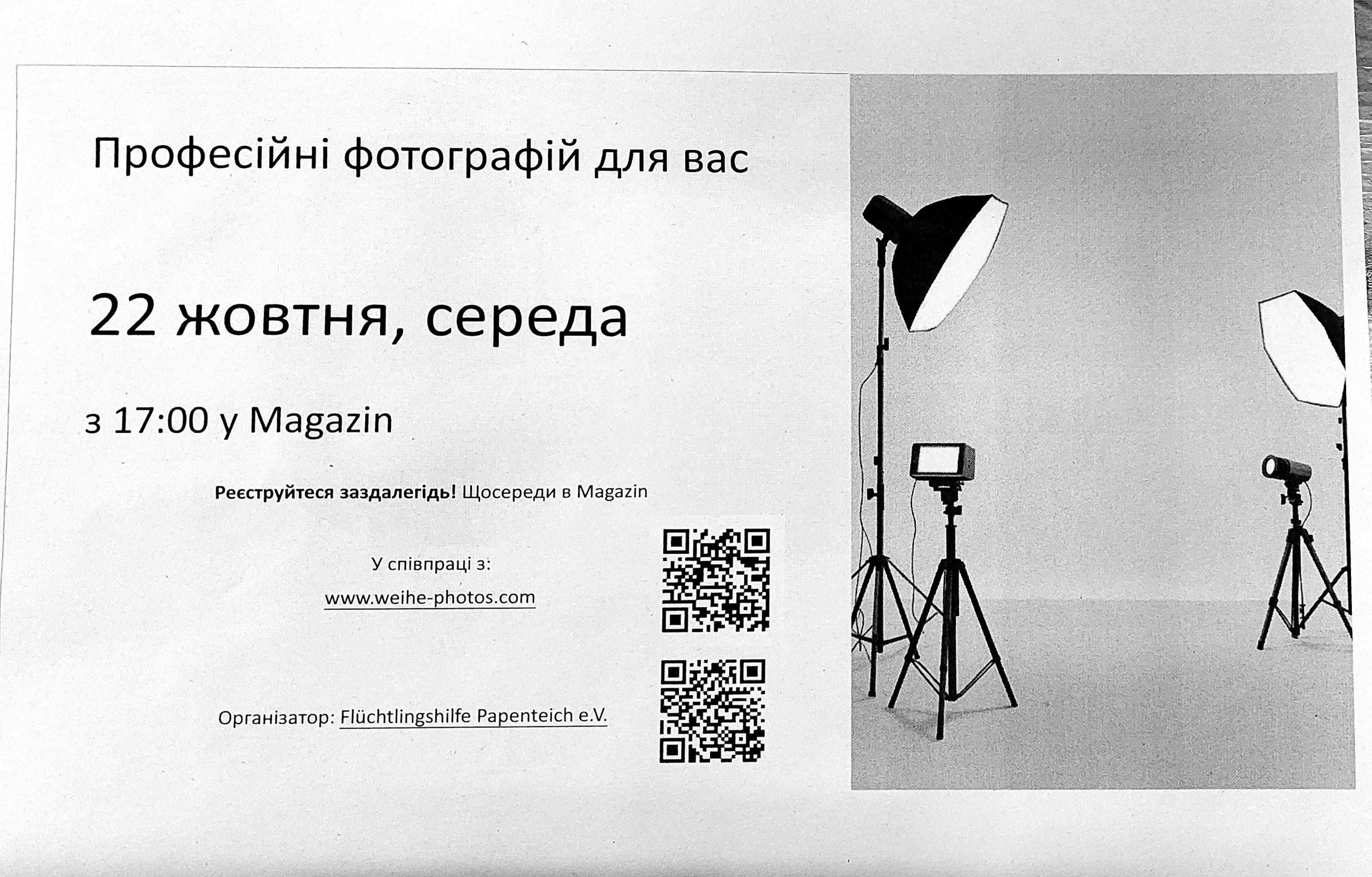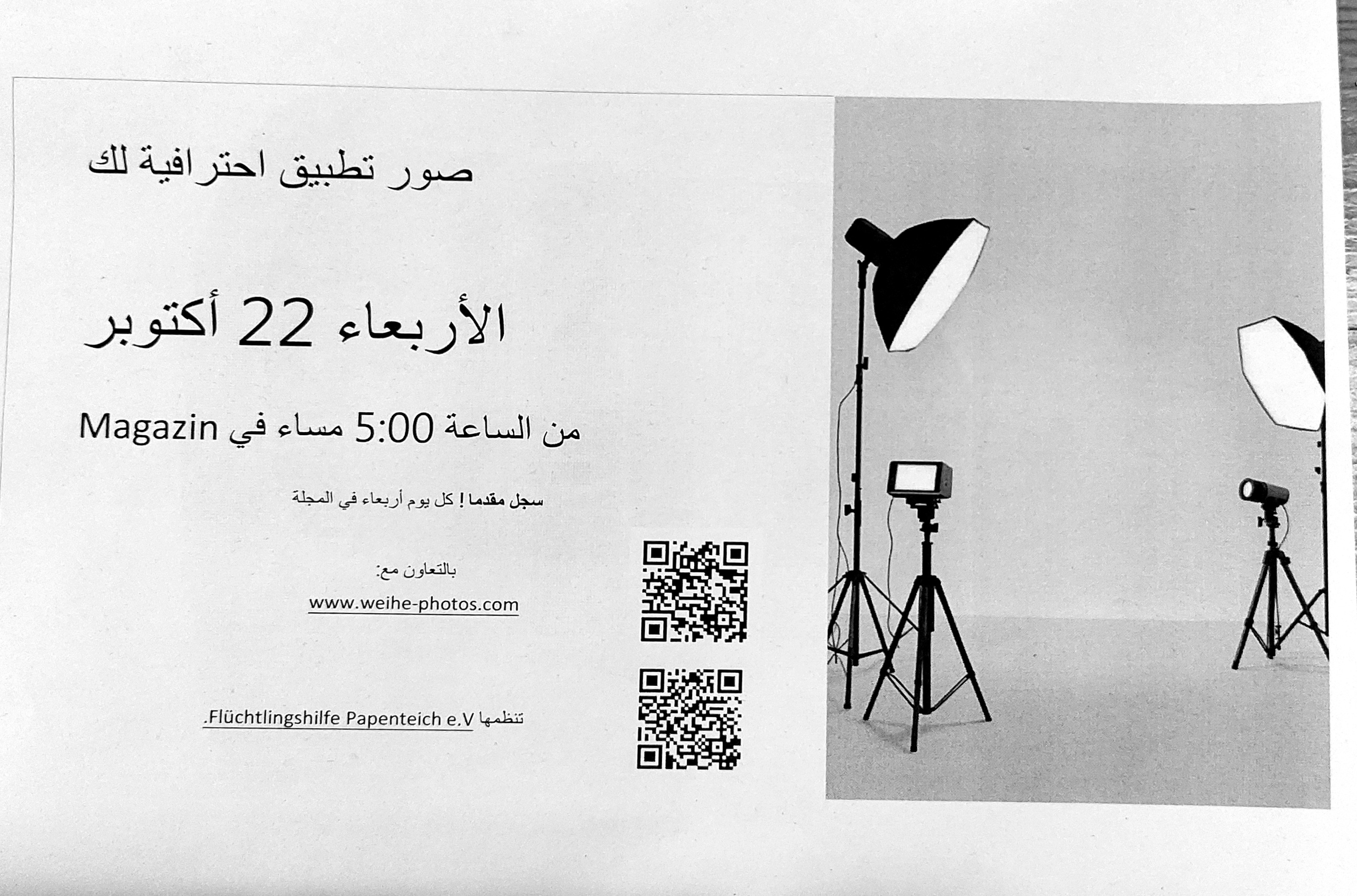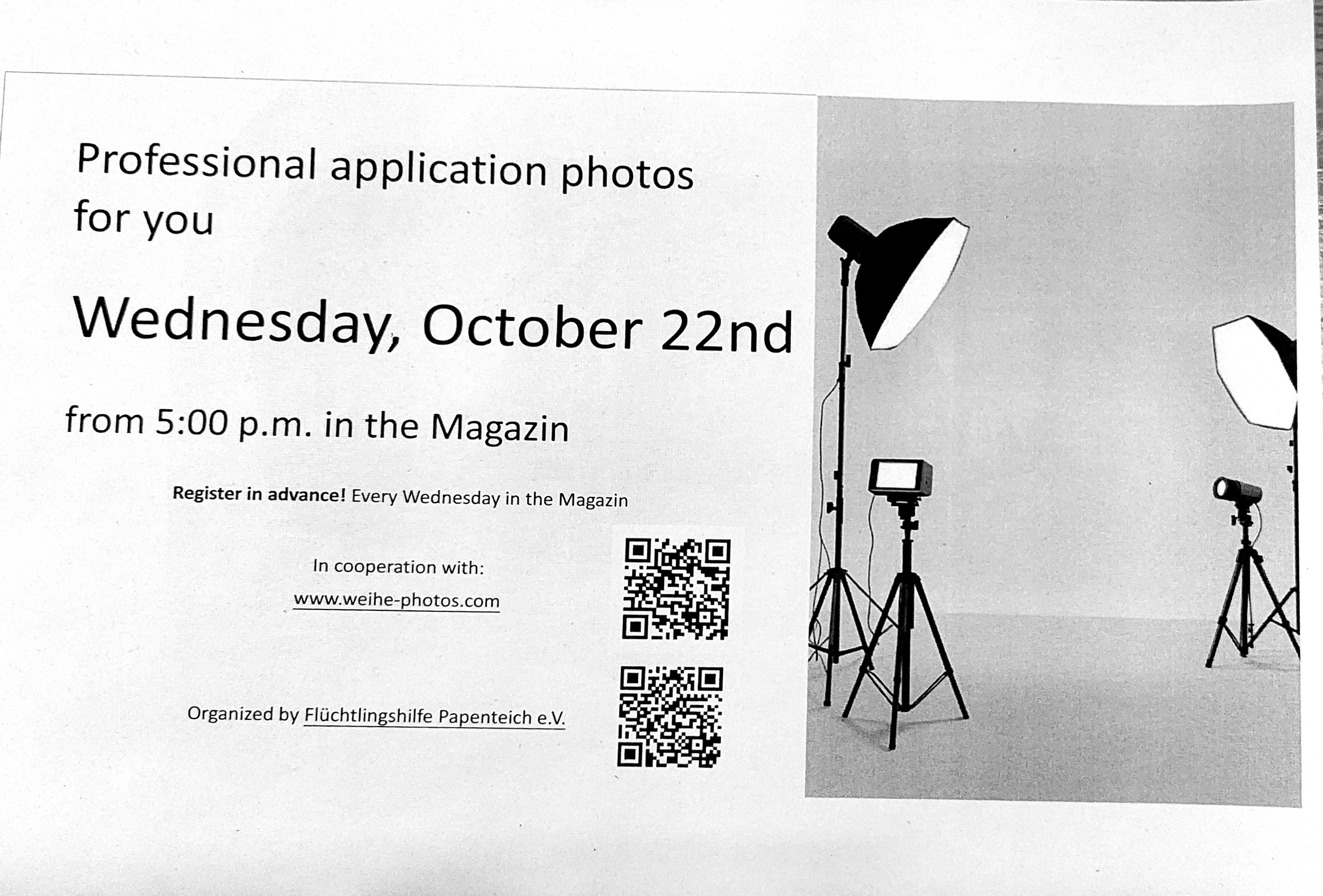 Wir bieten allen Geflüchteten die Anfertigung hochwertiger Fotos z.B. für Bewerbungen. Am Mittwoch, den 22.10.25 um 17:00 kommt zu diesem Zwecke ein professioneller Fotograf ins Magazin. Dieses Angebot ist für die Geflüchteten kostenlos.