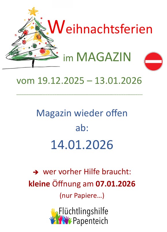 Die offizielle Weihnachtspause im Magazin dauert bis zum 13. Januar, das gilt auch für die Fahrradwerkstatt. Magazin und Fahrradwerkstatt öffnen wieder am 14. Januar. Ab dem 15.01.26 werden wieder Sachspenden zu den gewohnten Zeiten angenommen.